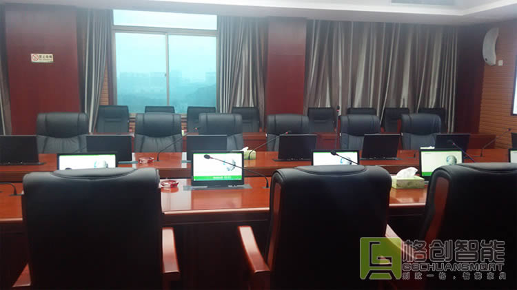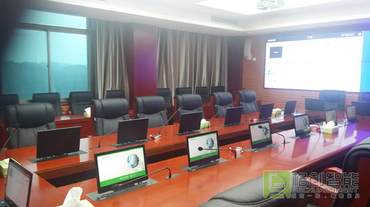 格創智能結合會議室的建筑結構及相關設計標準進行設計,為該項目配置超薄電容高清升降無紙化會議終端,智能服務器。此會議系統適合于各種高檔會議場合,以及重要的政務、商務、企事業單位和大型活動的會場。