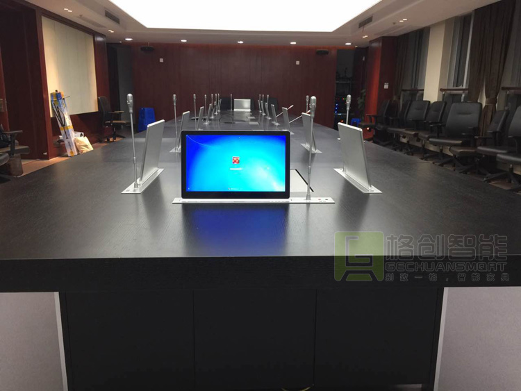 眾所周知,會議室是領導們開會傳達政策和指示精神的重要場所,所以在會議使用過程中絕不能出絲毫差錯。格創智能的無紙化液晶升降一體機終端,在會議召開時,將通過上升的方式展現于會議桌面以上,方便參會者觀看和瀏覽會議資料,并通過觸摸操作參與會議討論與交流;在會議結束之后一體機內所含的升降器將通過降下的方式收納于放置在會議桌面以下的一體機機體內,防盜、防塵,保持會議室的美觀與整潔。