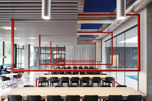 午餐只是食堂一個很小的功能,協作交流才是它重要的職責所在。漂亮的長桌、相對私密的車廂座、餐館式的休閑座椅、以及近旁的戶外花園,讓這里有著餐廳般舒適愜意的氛圍。長桌上方矩陣式的紅色照明燈具設計界定了一方空間,帶來有趣的視覺體驗。