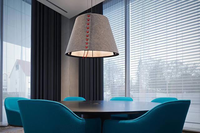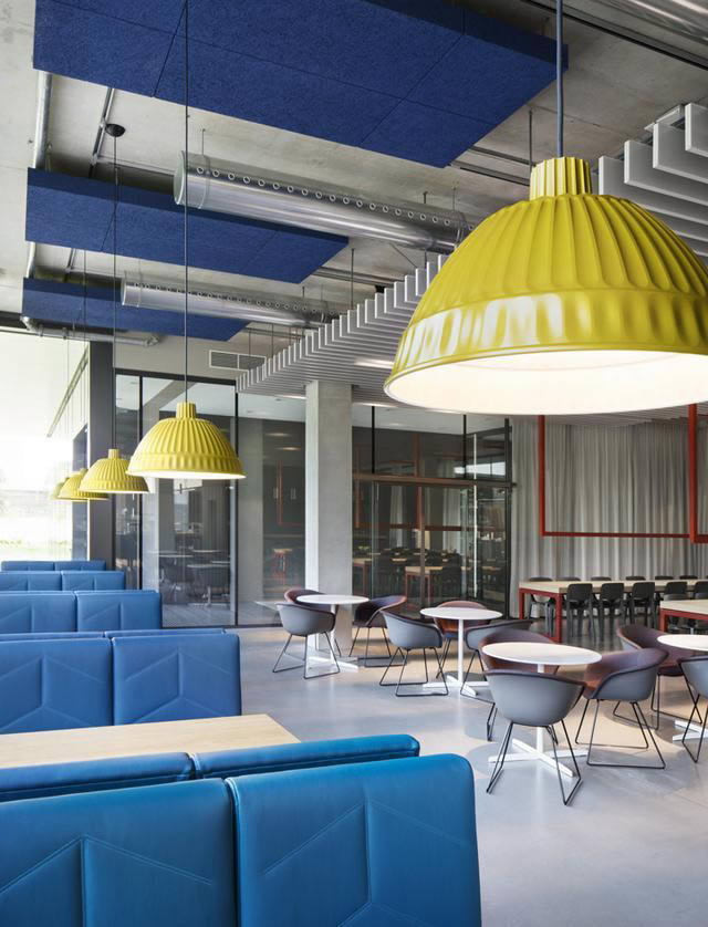 開放式布局是設計的基本,在AEB協作交流是工作方法和思維方式的重要組成部分。這一點顯而易見:一進入接待區,開敞的空間讓視線一覽無余,繽紛的座椅吸引著人們的目光穿過開敞通透的玻璃隔墻進入員工食堂,戶外優美的景觀成為最美的空間背景。